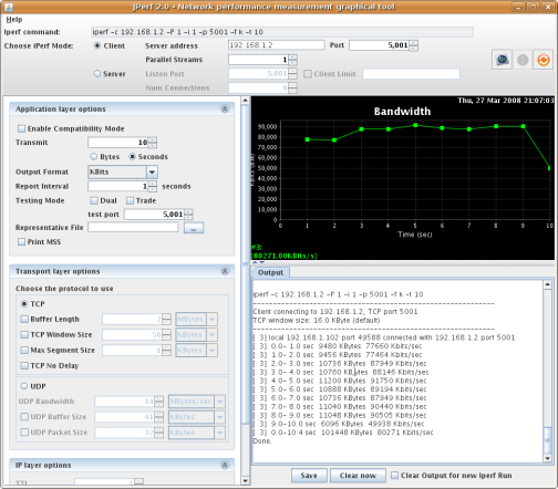 Iperf is a tool to measure the bandwidth and the quality of a network link. Jperf can be associated with Iperf to provide a graphical frontend written in Java.